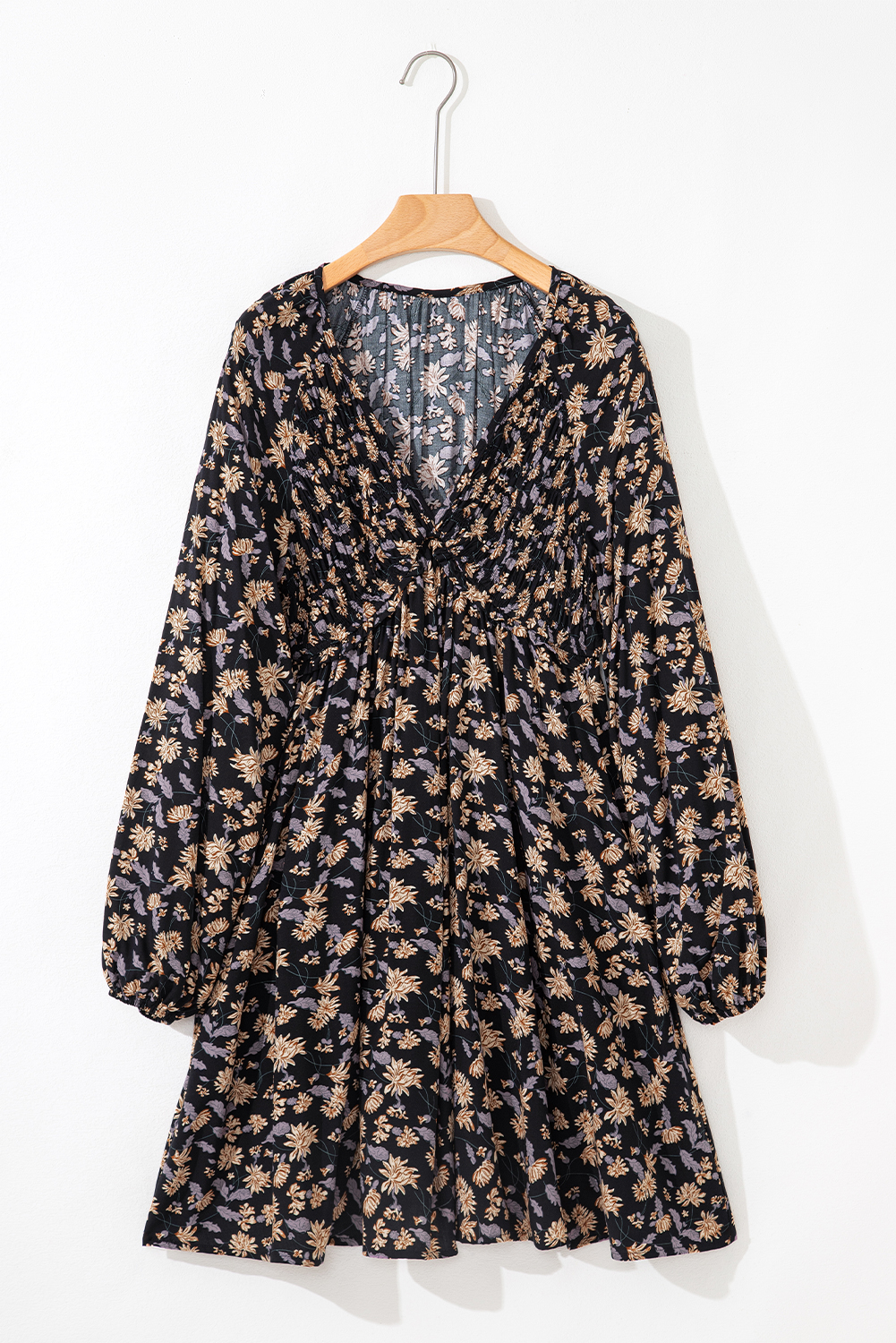 - A v-cut neckline, stretchy smocked bust, long loose sleeves with elastic cuffs