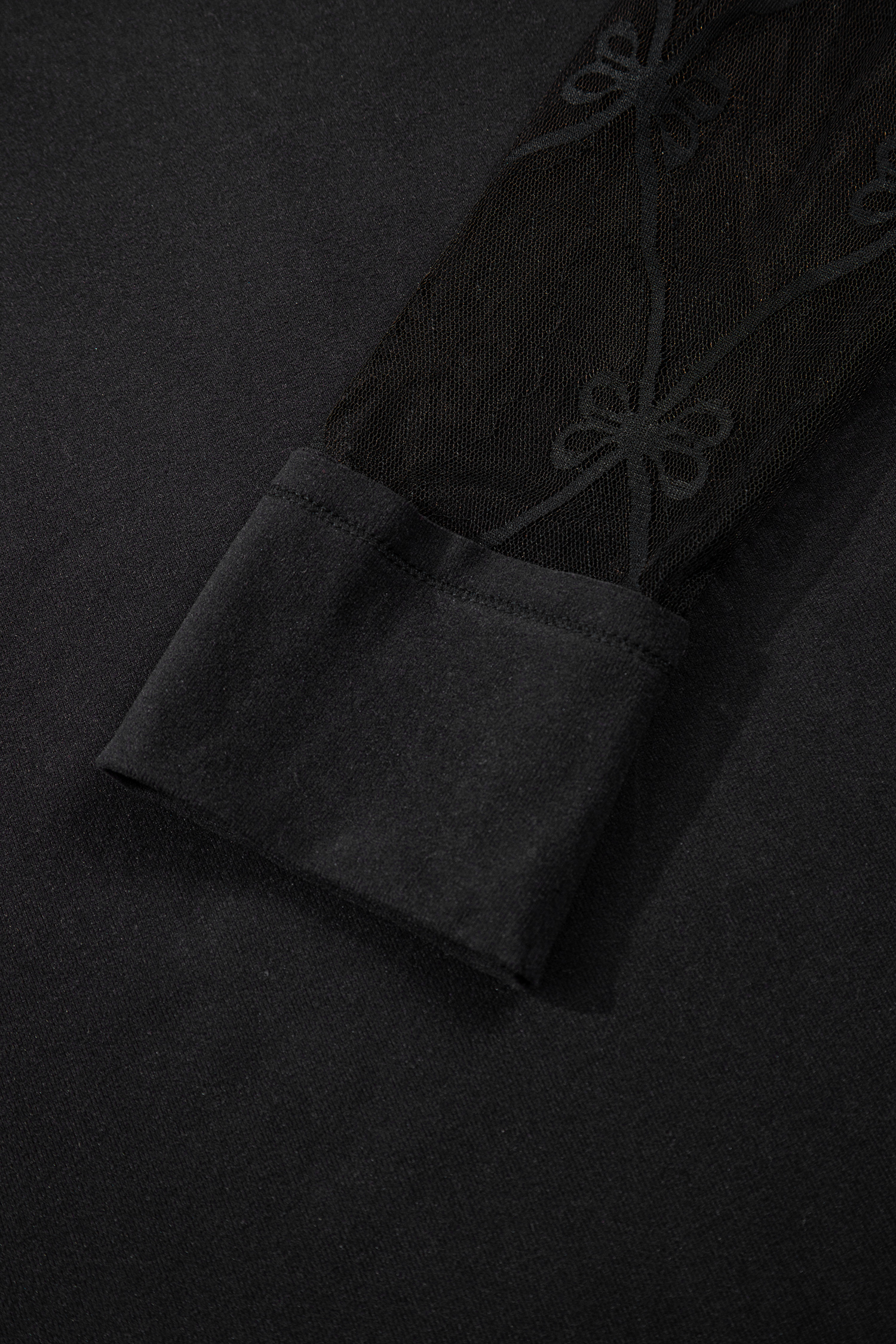 Featuring a solid tee body and sheer long sleeve patchwork.