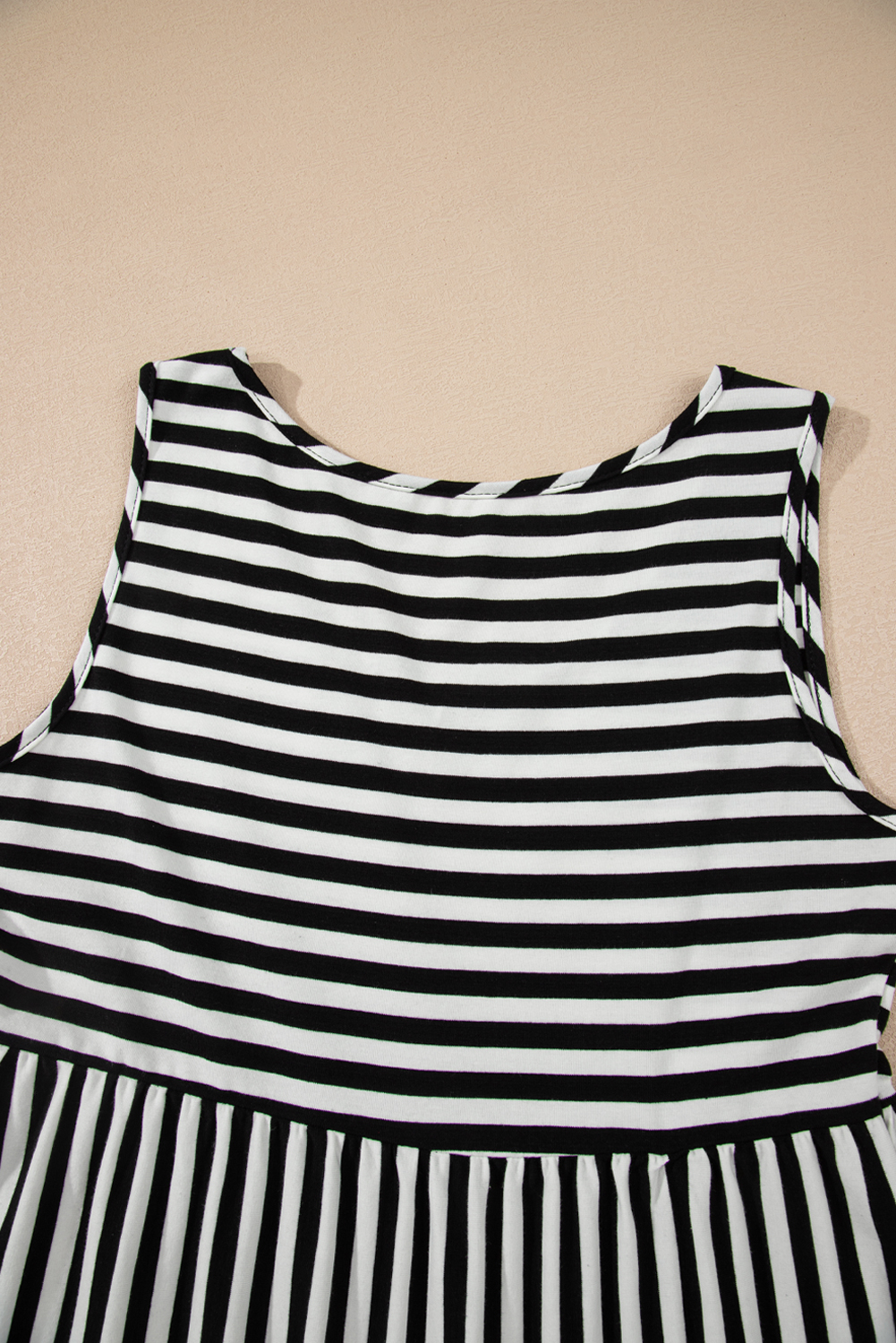 - This striped dress features chic U-necklines and sleeveless designs for a modern look.