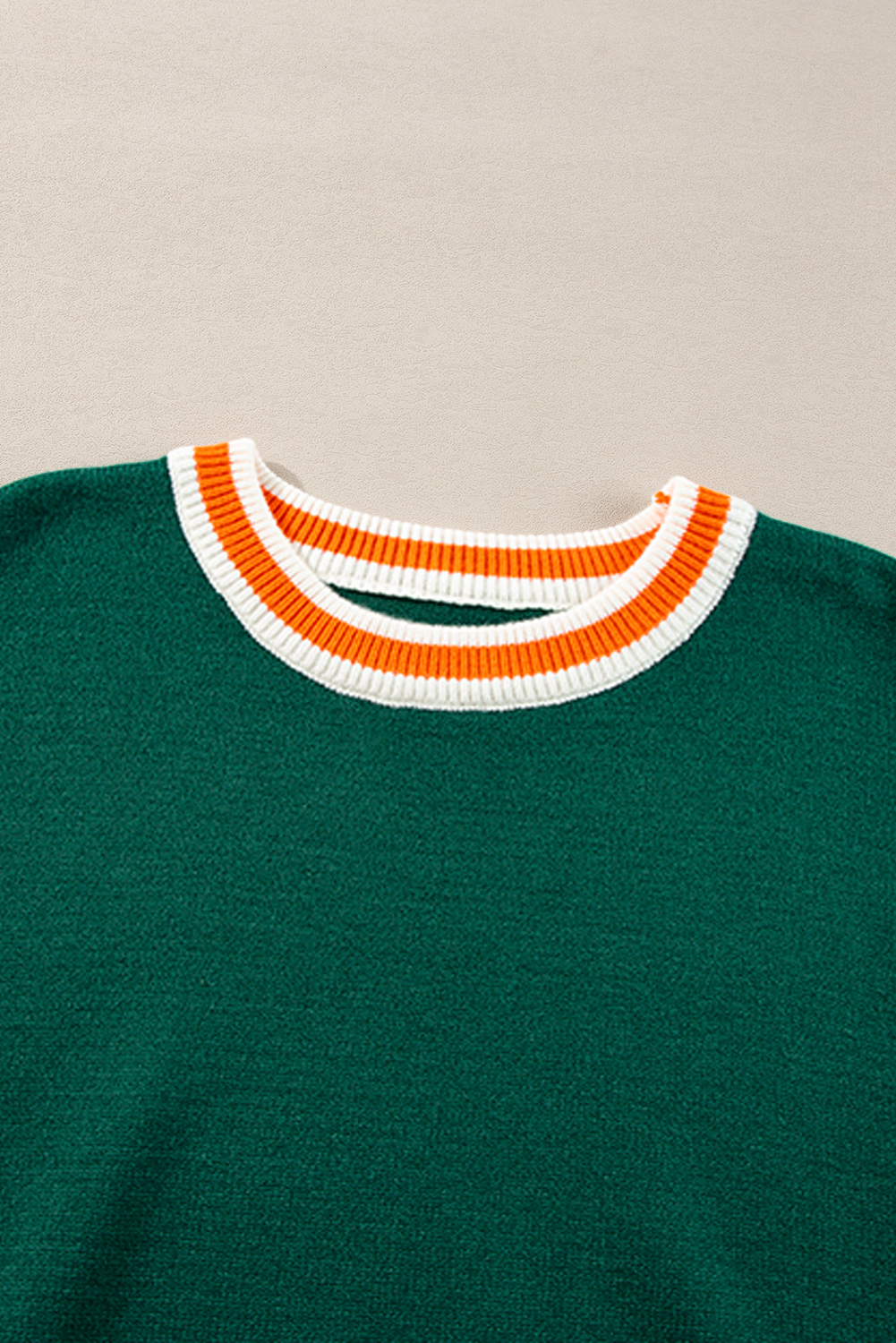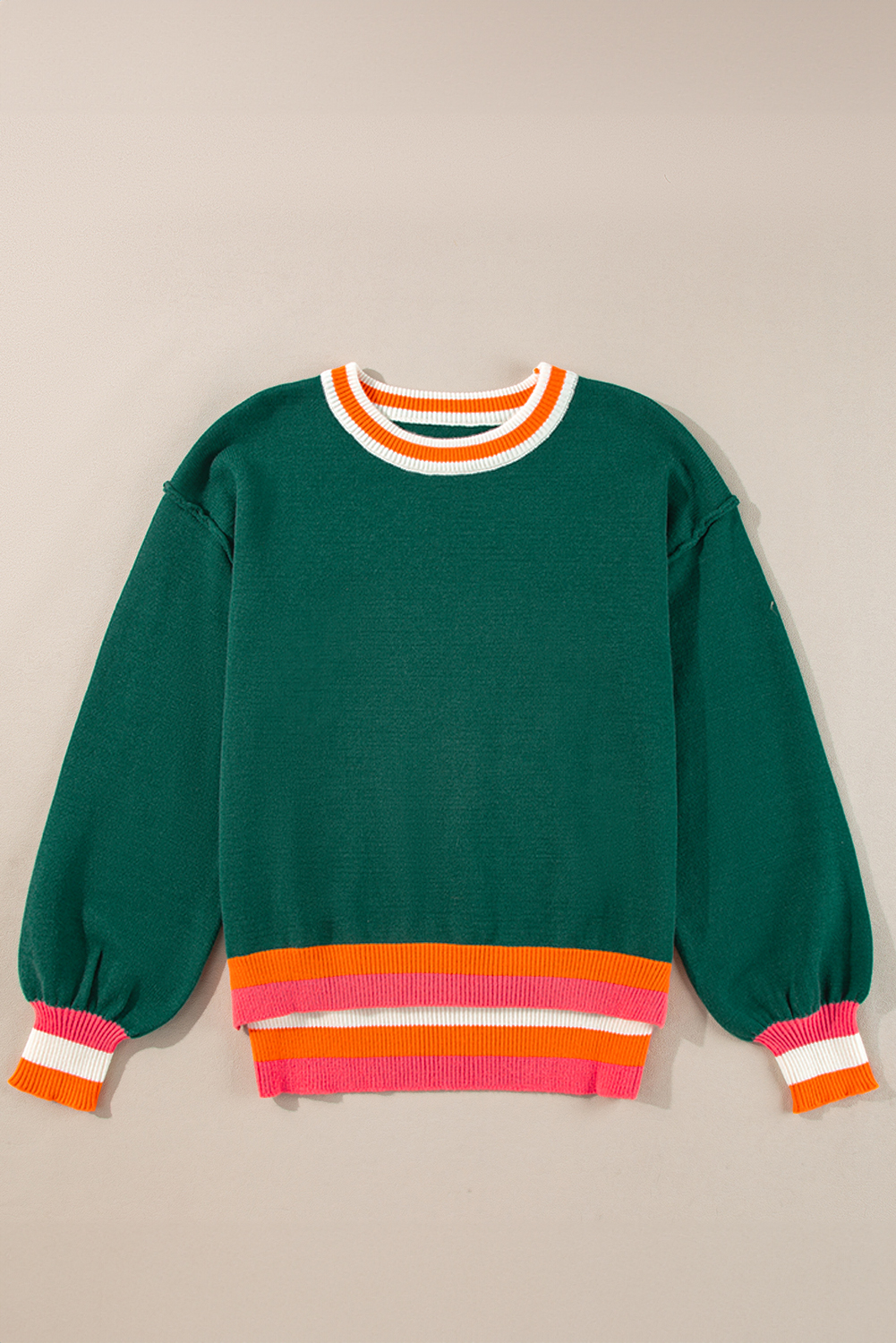 - Color-block striped trim enhances the sweater’s visual appeal.