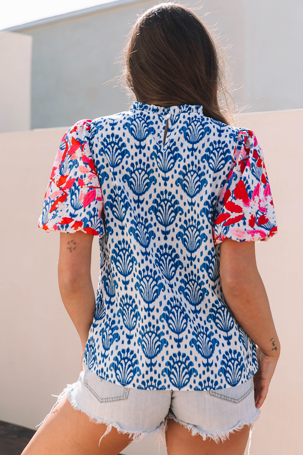 - It features a regular fit with a frilled neck with short puff sleeves.