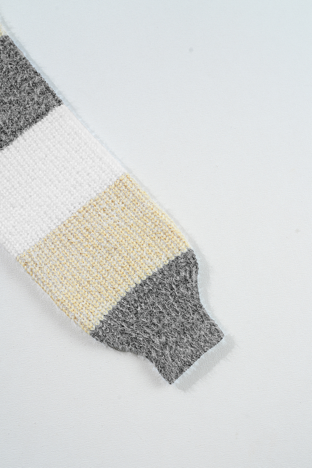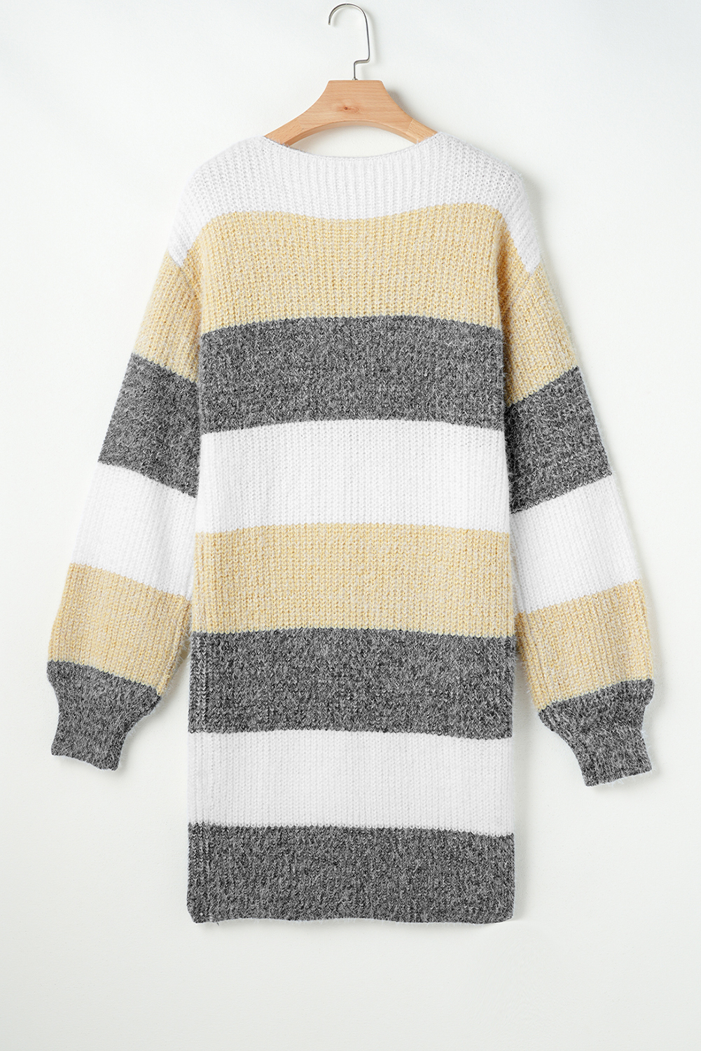 - The knitted dress features a vibrant colorblock design that adds a pop of color and visual interest.