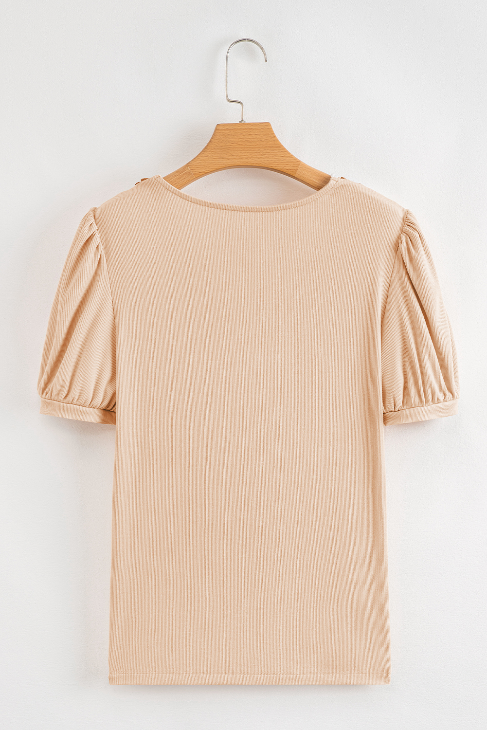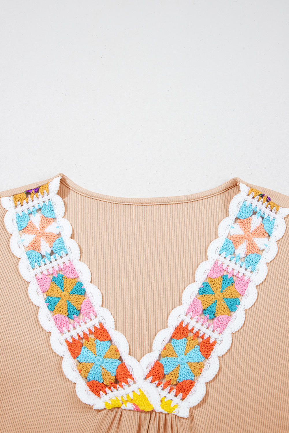 - Exude feminine charm with our Crochet Floral V Neck Textured Short Sleeve Blouse.
