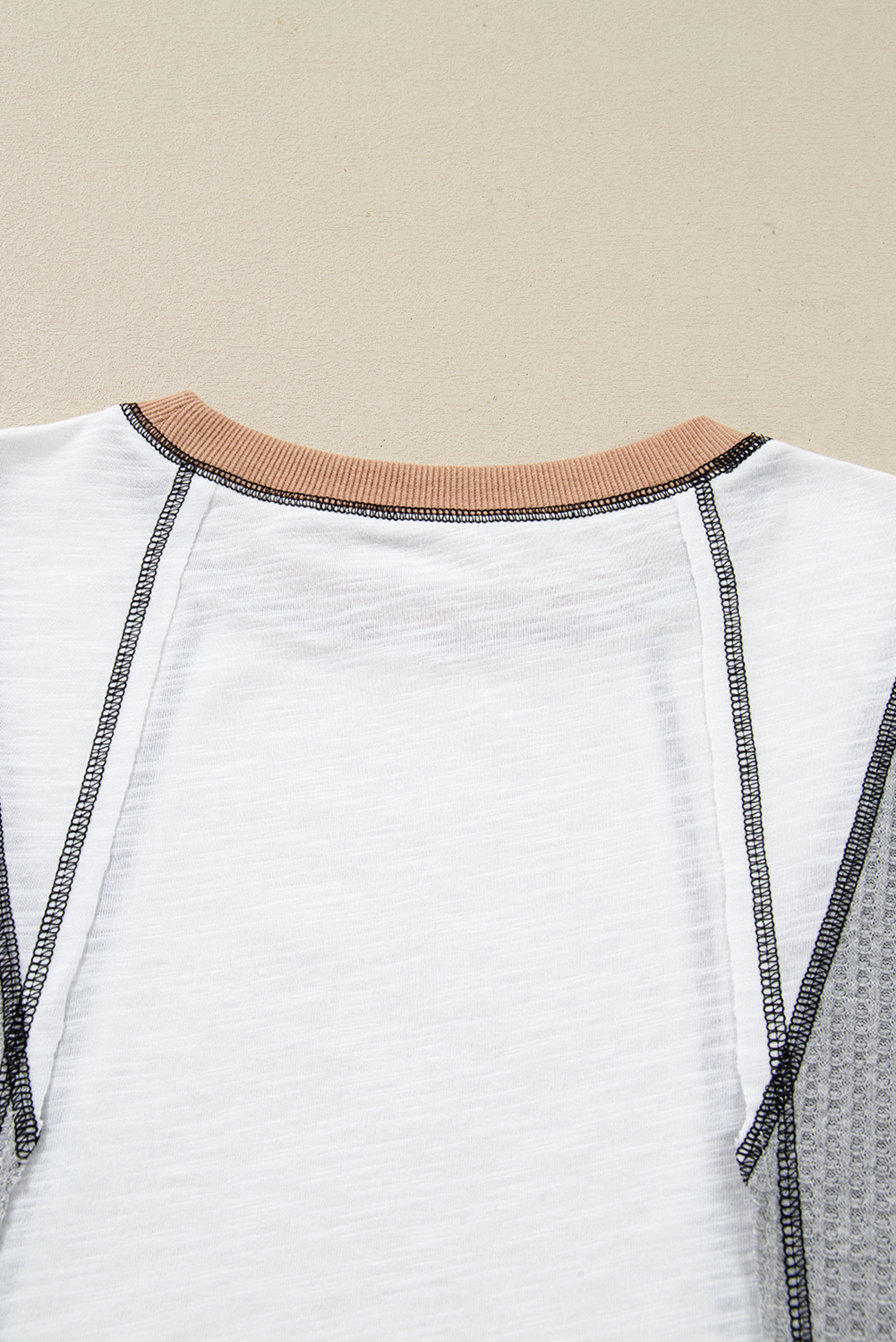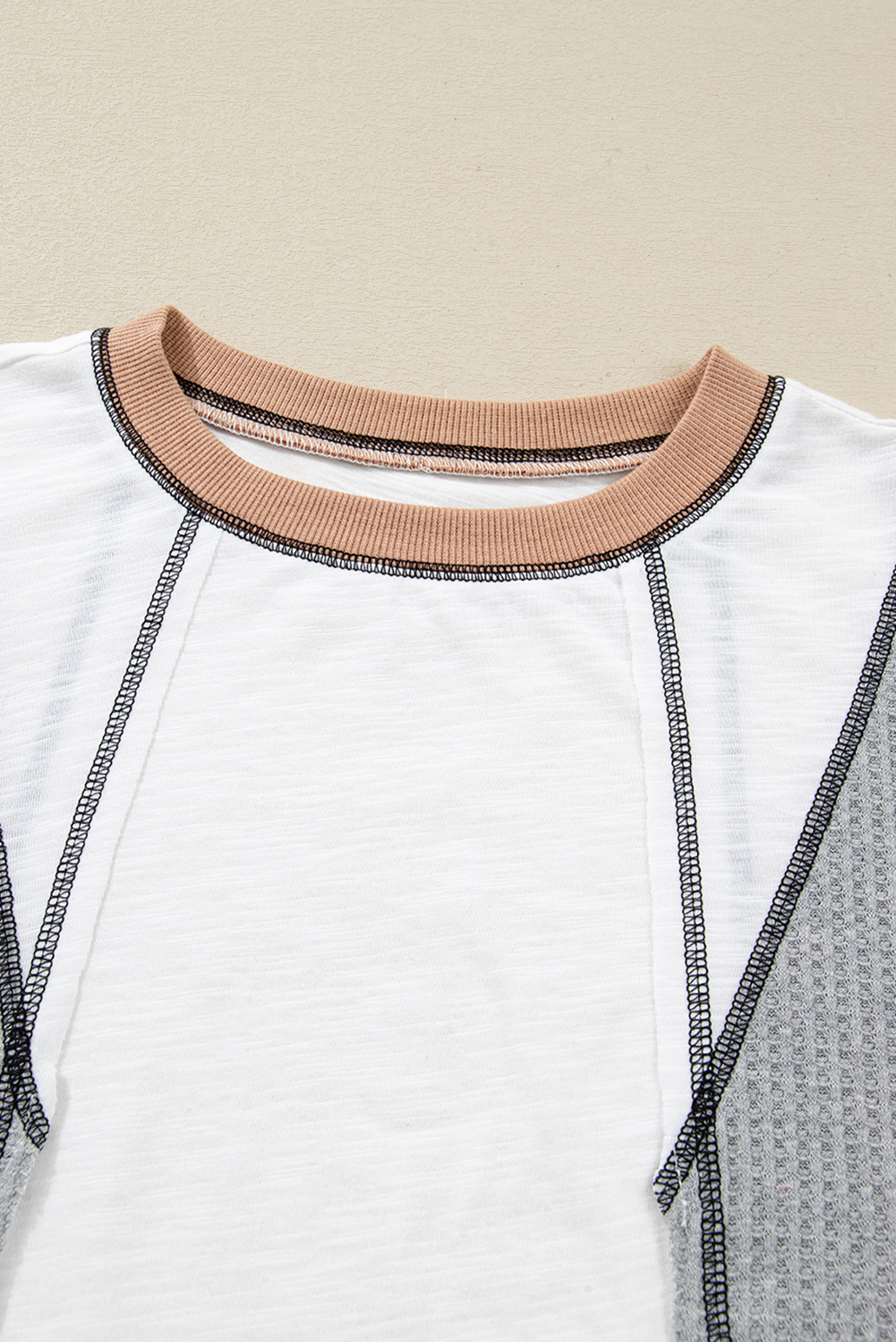 White Contrast Block Mixed Textured Knit Patchwork Casual Top