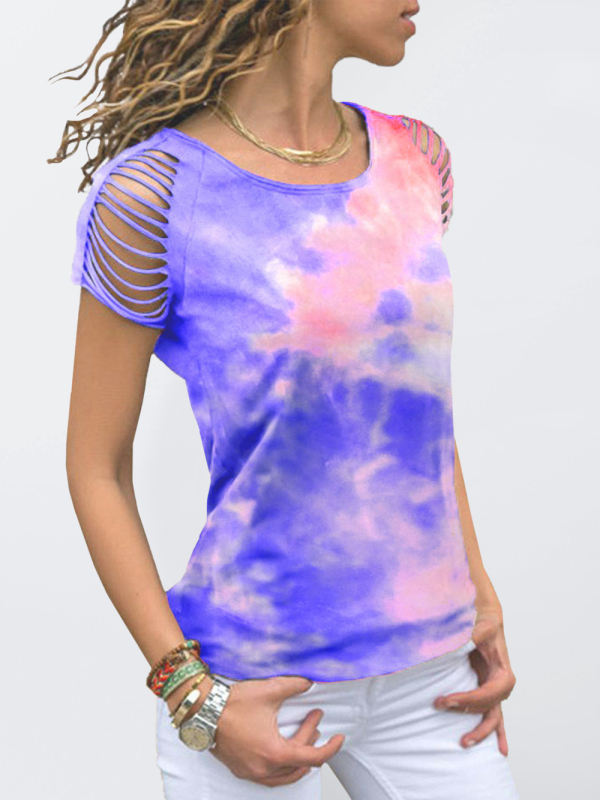 Women’s tie-dye ripped burnt-out off-the-shoulder short-sleeved T-shirt with fashionable style and soft and comfortable fabric. It can be worn daily, going out, dating, vacation, etc. Washing method can be machine wash or hand wash. Fabric is wrinkle and pill resistant. The size is measured by hand, and it is normal for there to be an error of 1-3cm.