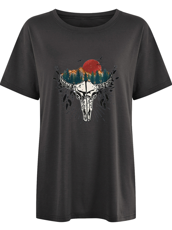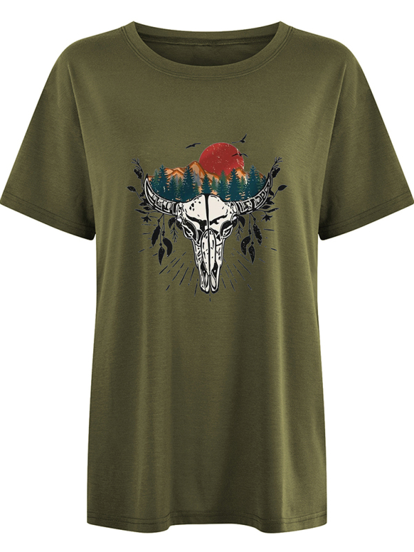 Women’s Western bull head print short sleeve T-shirt featuring a stylish style and soft and comfortable fabric. It can be worn for daily, dating, going out, vacation and so on. Washing method can be machine wash or hand wash. Fabric resists wrinkling and pilling. The size is measured by hand, and it is normal for there to be an error of 1-3cm.